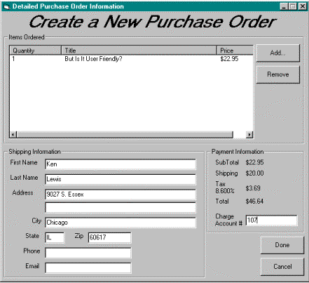 Figure 8. DNA PurchaseOrder application users can purchase a variety of books from the available "inventory" as part of a single purchase order, similar to the way you might purchase books from your favorite online bookstore (see Figure 9). Users browse the store's inventory of books, adding certain items to their purchase order, and removing others. When the user is ready to checkout, the purchase order is completed by providing a destination shipping address along with a customer account number for billing, and the order is submitted. When the application receives a purchase order request, it checks the quantity on hand of each book being purchased to make sure the entire order can be fulfilled. If not, the entire order is aborted. The application also checks to make sure the customer has enough available credit to facilitate the purchase. If not, the entire order is aborted.