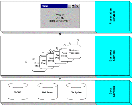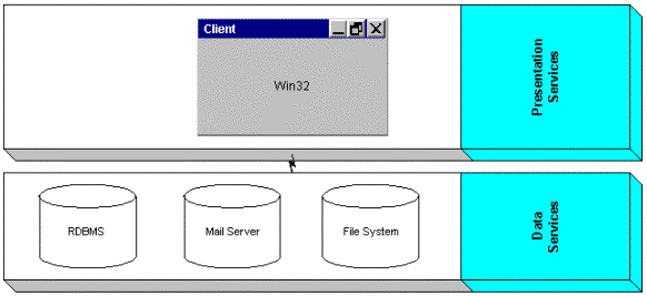 Figure 2. A two-tiered application is an application whose functionality can only be segmented into two logical tiers of functionality: presentation services and data services. The differences in the responsibilities of the presentation services for two- and three-tiered applications greatly influence the developer's perspective of the application as a whole. For example, in a two-tiered design the logic that performs the tasks that the application is being designed to automate (for example, income tax preparation, order processing, and so on), which is commonly viewed as "the application," executes wherever the presentation services are located. However, in a three-tiered design "the application" executes wherever the business services are located. Such fundamental differences can lead to all sorts of confusion when discussing three-tiered application concepts with two-tiered application developers or vice versa, which is why it's crucial to understand the fundamental difference in developer perspective associated with two- and three-tiered application designs. Windows DNA Design ObjectivesThe Windows DNA architecture is designed to maximize overall application: