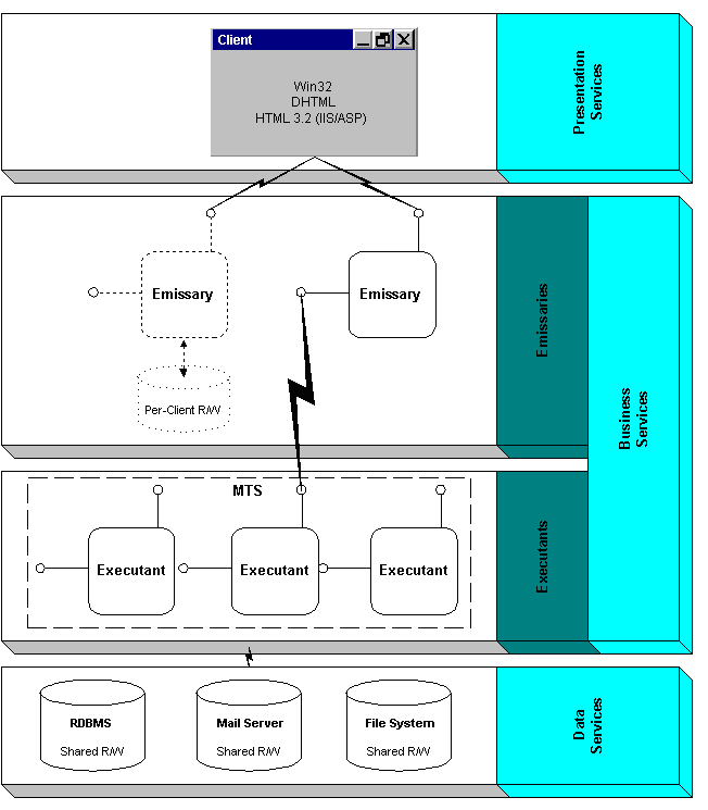 Figure 4. An architectural diagram of the various components involved in building a DNA application using the "Executants and Emissaries" methodology For a Windows DNA application to make its business operations available to the widest range of presentation services (dynamic HTML, Microsoft Win32®, and HTML 3.2), emissaries must be accessible from both interactive and non-interactive presentation services. Interactive presentation services are capable of providing feedback to the user on either a form-by-form or field-by-field basis. For example, an application that supports a Win32 user interface created in Microsoft Visual Basic® could immediately display error messages in response to invalid data entry in a field on a form.