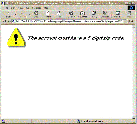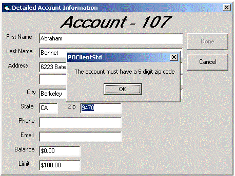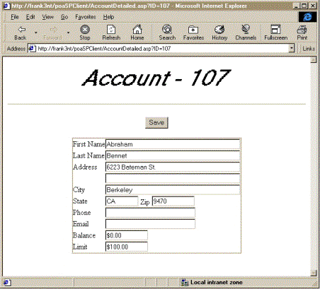 Figure 7. Because non-interactive presentation services require a trip to the server to perform their data validation routines, they are typically limited to providing feedback to the user on a form-by-form basis. While the HTML 3.2 user interface may be extremely non-interactive, it is supported by a wide variety of non-Windows platforms, including Linux, UNIX, and Macintosh, which makes HTML 3.2 ideal for extending the reach of an application to a variety of different platforms. Windows DNA applications should be designed to accommodate both interactive presentation services such as dynamic HTML and Win32 for corporate intranet users that expect the rich presentation services of Windows as well as non-interactive presentation services such as HTML 3.2 for supporting Internet and corporate extranet users. For an emissary to support interactive presentation services it must support both property-level and object-level validation. However, for an emissary to support non-interactive presentation services, it only needs to support object-level validation. Property-level validation is the process of ensuring that an individual property is within a predefined range of acceptable values. For example, an Account emissary that supports property-level validation would ensure that its Zip property contains a valid ZIP code as defined by the United States Postal Service. Supporting property-level validation allows emissaries to provide immediate feedback to interactive presentation services like those created using dynamic HTML or Win32. Object-level validation is the process of ensuring that all of an object's properties are within their respective predefined ranges of acceptable values. For example, an Account emissary that supports object-level validation would only be valid if it contained a valid ZIP code and a valid State. A valid ZIP code with a non-valid State would equal a non-valid Account emissary. Supporting object-level validation allows emissaries to provide feedback to non-interactive presentation services like those created using HTML 3.2. ReliabilityReliability refers to an application's ability to provide accurate results. An application isn't reliable if it returns inaccurate results. However, ensuring accurate results in a multiuser environment is very difficult. For example, suppose an application is designed to transfer money from one account to another by crediting one account and debiting the other. While this seems like a simple operation, imagine the results if any part of the system hardware or software fails after crediting money to one account, but before debiting money from the other. Or, imagine if two clients increment an account's balance by US$50.00 as the result of a recent purchase. Both clients read the current balance US$100.00 and then increment the current balance by US$50.00 (balance = balance + US$50.00) for an inaccurate final balance of US$150.00 (the final balance should really be US$200.00). To ensure accurate results, executants should perform their business operations as part of a Microsoft Transaction Server (MTS) managed transaction. Transactions ensure that state transformations are Atomic, Consistent, Isolated, and Durable (ACID).